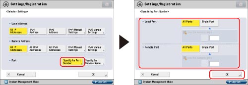 Press [Specify by Port Number] for <Port> → specify <Local Port> and <Remote Port> → press [OK].