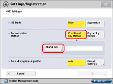 Press [Pre-Shared Key Method] for <Authentication Method> → [Shared Key].