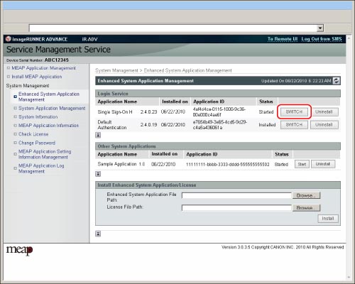 Default Authentication (Department ID Management) is set to a usable state as the default. If you want to use SSO-H, set [Department ID Management] to 'Off' before changing the login service. For more information on Department ID Management settings, see "Specifying Department ID Management."