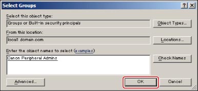 Enter 'Canon Peripheral Admins' in the group selection dialog box → click [Check Names].