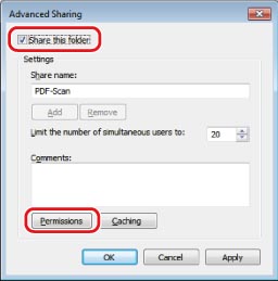 For Windows Vista/Windows 7, right-click the "PDF-Scan" folder → select [Properties] to display the [PDF-Scan Properties] dialog box → click the [Sharing] tab → click [Advanced Sharing] → select [Share this folder] → click [Permissions].