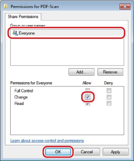 For Windows XP, select [Everyone] → select [Allow] for [Modify] → click [OK]. For Windows Vista/7, select [Everyone] → select [Allow] for [Modify] → click [OK] → [Close].