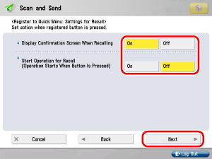 If [Off] is selected, when the registered button is recalled, the confirmation dialog box for the settings is not displayed.