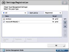 You can sort the paper type list by registration date ([Registered]), name ([Name]), or basis weight ([Basis Weight]) from the Sort List drop-down list.