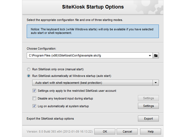 Ensures that SiteKiosk will always automatically start up using the correct parameters and the Windows desktop shell will be replaced with a special SiteKiosk shell.