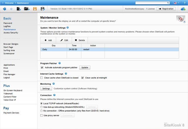 You can use the optional remote management tool SiteRemote to monitor, maintain and remotely control your kiosk computers online. Additional charges apply for using SiteRemote.