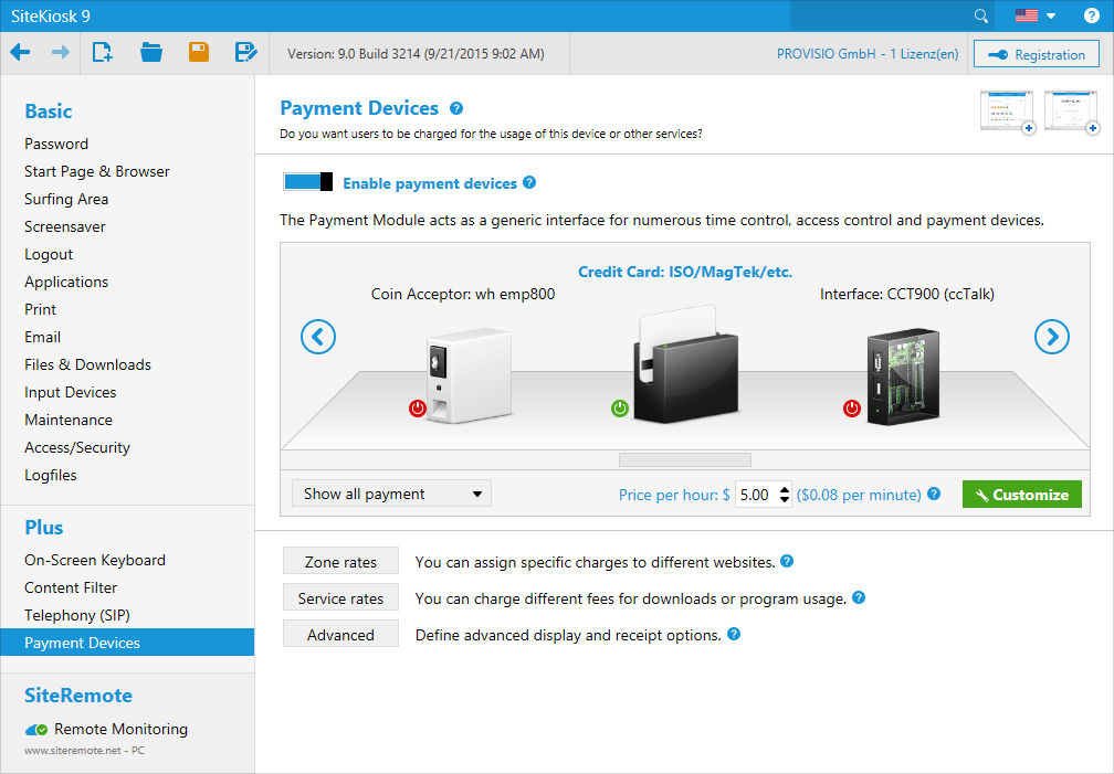 SiteKiosk allows you to charge for using the computer. A variety of cash acceptors, credit card readers and credit card gateways are supported.