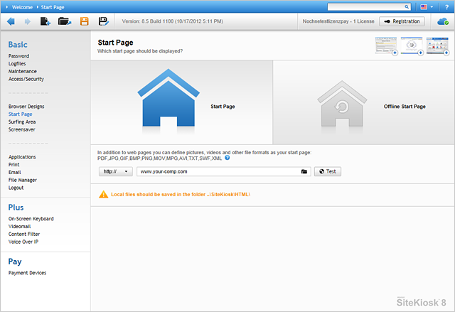 With SiteRemote, you can distribute multimedia content to your SiteKiosk machines from the server. Your content can be displayed during idle time as screen saver or in split-screen display mode with SiteKiosk.