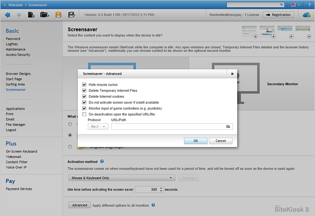 A session will be terminated automatically after a specified idle time. All browser and application windows will be closed, all user traces will be deleted, and the SiteKiosk browser returns to the Start Page.