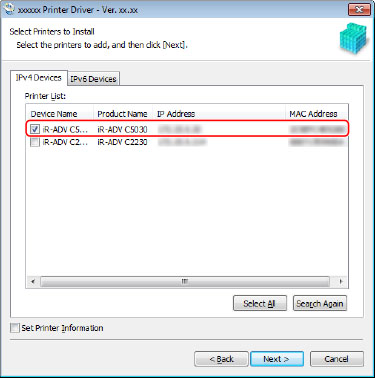 If the device is not displayed in [Printer List], click [Search Again]. If the device is still not found, select [Custom] and install.
