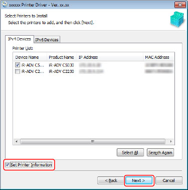 If you want to change the name of the device, or set it as the default device, select [Set Printer Information] → click [Next].