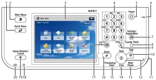 Includes the keys, touch panel display, and indicators required for operating the machine. (See "Control Panel Parts and Functions.")