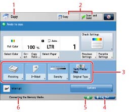 The progress of jobs and copy operations, and the status of devices and consumables are displayed here. Also, depending on the login service you are using, the Department ID or user name can be displayed.