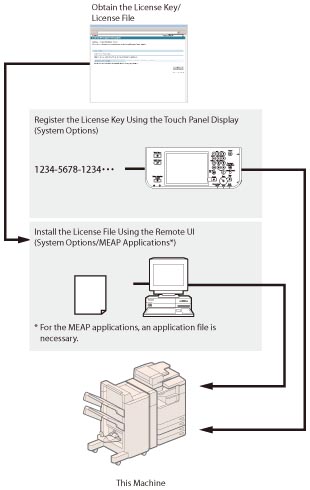 You can install system options/MEAP applications in the machine using the Register/Update Software function.