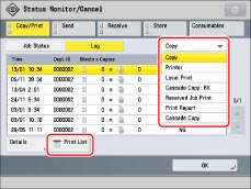 Press the drop-down list → select the type of job to print → press [Print List].