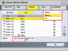 To print the reception history for the Fax Activity Report, select [Fax] in the drop-down list. (See "FAX ACTIVITY REPORT TX/RX.")