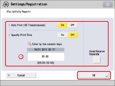 Press [On] to automatically print the Fax Activity Report when the number of send and receive transmissions reaches 40.
