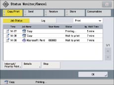(Status Monitor/Cancel), the Status Monitor/Cancel screen appears, enabling you to check and change the status of Copy/Print, Send, Receive and Store jobs.