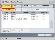 Displays detailed information for the selected job. Check the detailed information → press [OK] to return to the Copy/Print screen.