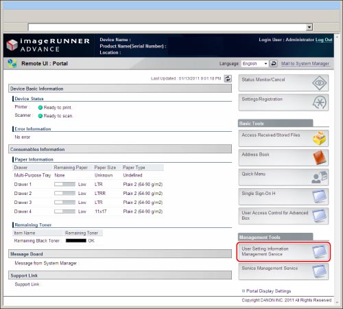 To specify each setting for User Setting Information Management Service, it is necessary to access and then log in to the machine from the Web browser. This section describes the procedure for accessing the machine from the portal page of the Remote UI.