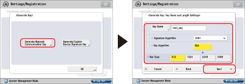 You cannot specify 'Device Signature Key' (used for key pairs for adding digital signatures to PDF or XPS files) or 'AMS' (used for key pairs for access restrictions) as the name for the key pair.