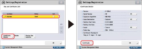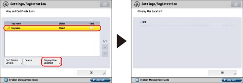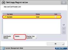 Key pairs for which 'Used' is displayed in <Status> cannot be deleted because they are being used with the IEEE802.1X authentication/IPSec or because SSL is set to 'On'. Press [Display Use Location] to check the type of security the key pair is being used for. To delete a key pair which is only being used with SSL, set the following settings to 'Off'. A key pair being used for IEEE802.1X authentication/IPSec cannot be deleted.
