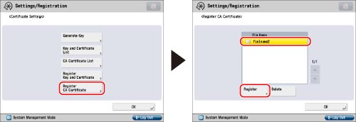 Press [Register CA Certificate] → select a file name → press [Register].