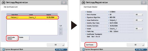Select the key pair for the CA certificate you want to confirm → press [Certificate Details] → [Certificate].