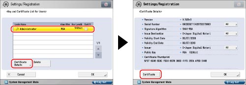 You can also use the Remote UI to confirm the key pairs and user certificates for all users. For more information, see "Installing a Certificate File."