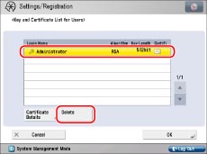 For information on how a general user can display the user certificate, see "Checking a Device Signature/User Signature Certificate." However, in this case, only the user certificate for the user who is currently logged in is displayed. User certificates for other users cannot be displayed. The user certificate also cannot be deleted from this screen. A general user must use the Remote UI to delete their user certificate. (See "Installing a Certificate File.")