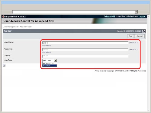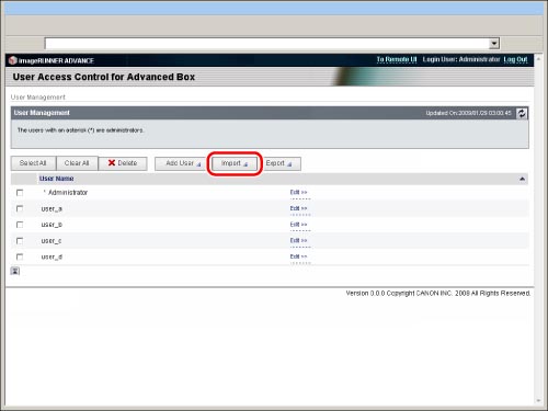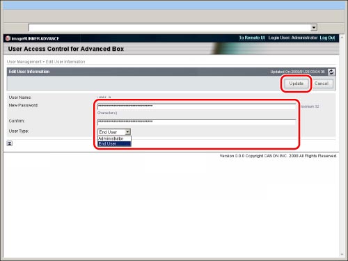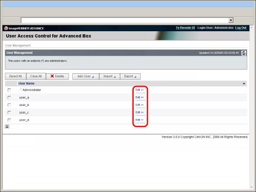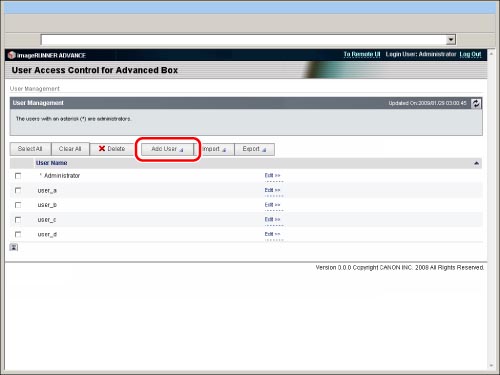 Only the Advanced Box administrator can register/edit the user information on the [User Management] page of [User Access Control for Advanced Box]. General users can only change their own password. (See "Editing User Information by General Users.")