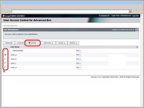 When you delete user information, it is recommended that you also delete any personal spaces that the user has created. The personal spaces that each user has created can be deleted using the Remote UI. For more information, see "Specifying the Advanced Box Settings."