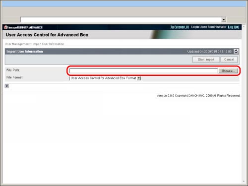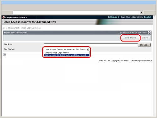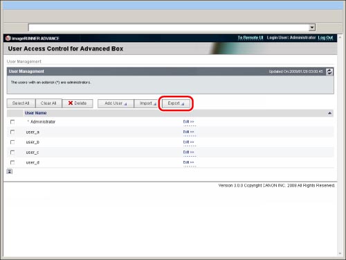 Export user information when you back up data on the Advanced Box to use on another imageRUNNER ADVANCE series machine. You can use the data stored on the Advanced Box if you import the user information into the other machine. For information on backing up/restoring stored data, see "Backing Up Stored Data."