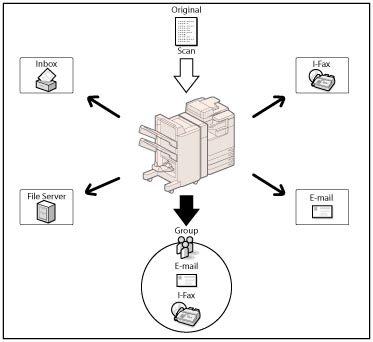 (E-Mail), (Fax), (I-Fax), (File), or (Group) destinations for each type appear. |