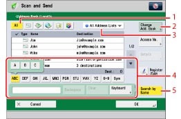Press the alphanumeric keys (e.g., [ABC]) to display the individual keys for each letter or number. You can select a letter or number to restrict the displayed range of entries. Press [All] to return to the full address list.
