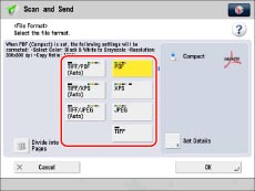 Sends the file in either the TIFF (Black-and-White) or PDF (Grayscale/Color) format. If you select this file format, [TIFF/XPS] appears on the Scan and Send Basic Features screen.