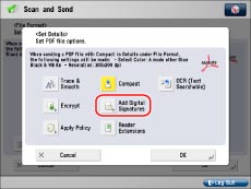 You can only add device signatures to PDF or XPS documents if you have generated a device signature certificate and key pair. (See "Generating and Confirming a Key Pair and Device Signature Certificate and User Certificate for Adding Digital Signatures to PDF or XPS Files.")