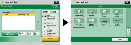 If you Divide into Pages: The file name prefix is generated by the year, month, day, hour, minute, and second the file is sent, and the five digits that signify the page number of the image. Examples: 20090707203000_00002.tif 20090707203000_00002.jpg 20090707203000_00002.pdf 20090707203000_00002.xps If you do not Divide into Pages: The file name is composed of the year, month, day, hour, minute, and second the file is sent. Examples: 20090707203000.tif 20090707203000.pdf 20090707203000.xps You can specify a file name using the Remote UI when sending to an e-mail/I-fax address or a server that is stored in [Favorite Settings]. (See "Specifying a File Name for Transmission to a Destination in Favorite Settings.")