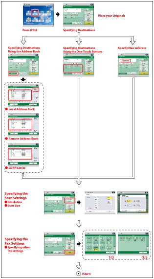 Press to set useful fax functions such as sending different sized originals together or 2-sided originals.