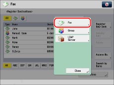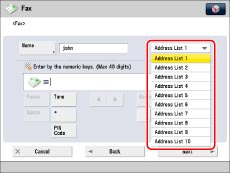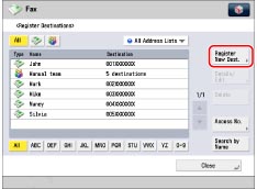 The first character that you enter for the name is used for sorting the destination list when you press keys, such as [ABC], [DEF], and [GHI], on the Address Book screen. If [Search by Name] is pressed on the Address Book screen, a screen for narrowing the search in the Address Book appears.
