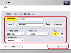 Press [Set Details] to set the subaddress, password, ECM TX, Sending Speed, and Long Distance. If the machine is set to use multiple lines, you can also select the line to use when sending.