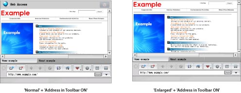 You can change how the Web Access screen is displayed to suit your needs. There are four types of screens which can be created with different combinations of the screen size and display/hide address bar settings.