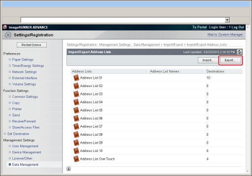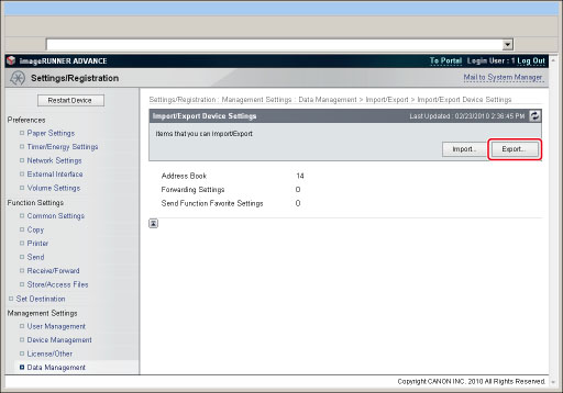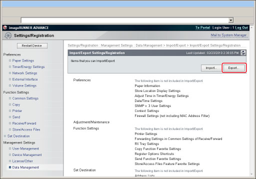 Click [Import/Export] → [Device Settings (Forwarding Settings, Address Book, Send Function Favorite Settings)] → [Export...].
