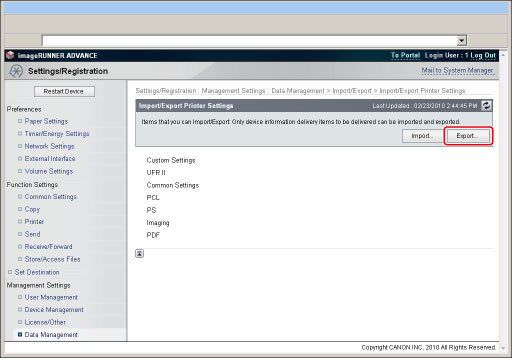 Click [Import/Export] → [Printer Settings] → [Export...].
