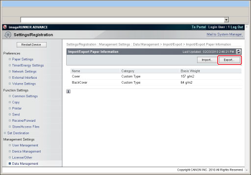 Click [Settings/Registration] → select [Data Management] for <Management Settings>.