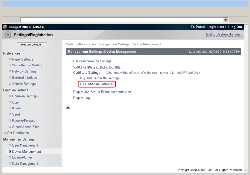 Click [Settings/Registration] → [Device Management] for <Management Settings>.