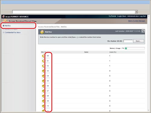 Click [Access Received/Stored Files] → select [Mail Box] → click the number of the desired mail box.