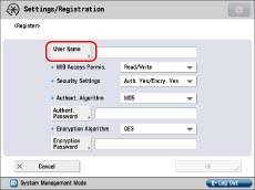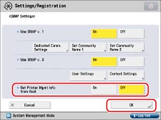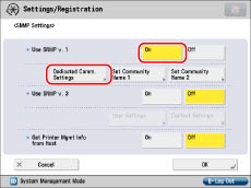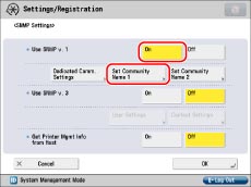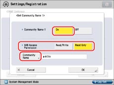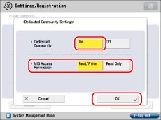 Press [On] for <Use SNMP v. 1> → [Dedicated Comm. Settings]. Press [On] for <Dedicated Community> → [Read/Write] for <MIB Access Permission>.