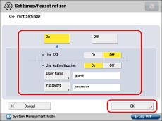 Press [On] to confirm the Department ID and PIN when printing using a driver that supports Windows Vista/7. [Use HTTP] is automatically set to 'On' if you select [On].