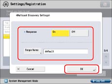 Press [On] for <Response> to use device information from other machines, such as an Address Book or Department ID Management settings, or respond to a multicast discovery from utilities.